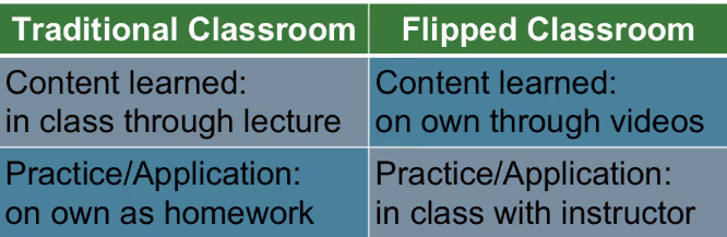 This model is called the ‘flipped’ classroom to contrast with a traditional classroom where students access content during a scheduled in person lecture and then engage in practice or application of content on their own as homework. The differences between the two models is in where and with whom the students access content and then practice or apply content.